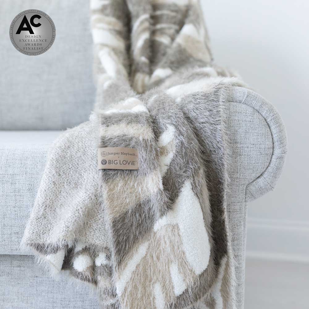 Plush and perfectly oversized, “Pluto” is an elegant riptide of natural-hued swirls. The neutral tones seemingly change from warm to cool, depending on the light. Drape this beauty over your couch or bed for an artistic accent that will keep you warm and luxuriously cozy.